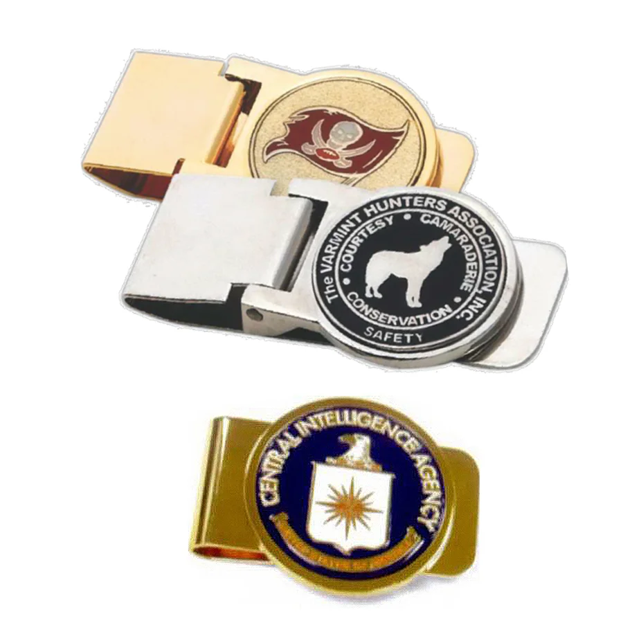 Nickel or gold spring money clip. 1-1/16" full color photo dome insert or die struck enamel up to 4 colors.
