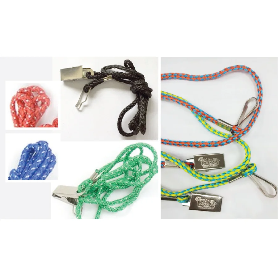 36" round woven string lanyard with a j hook on one end and a bull dog clip on the other end. Perfect for a casino slot card retainer cord. COLORS: almost any color and can intertwine multiple colors. Can also have logo on bulldog clip. Available in almost any color.