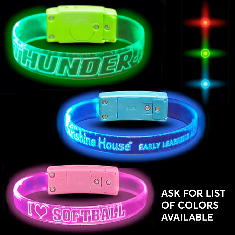 Add your logo to these amazing LED wristbands and see the design light up and glow! The message or logo is laser etched onto the inside of the band and when illuminated by the LED’s the bands will glow and will be sure to draw attention!